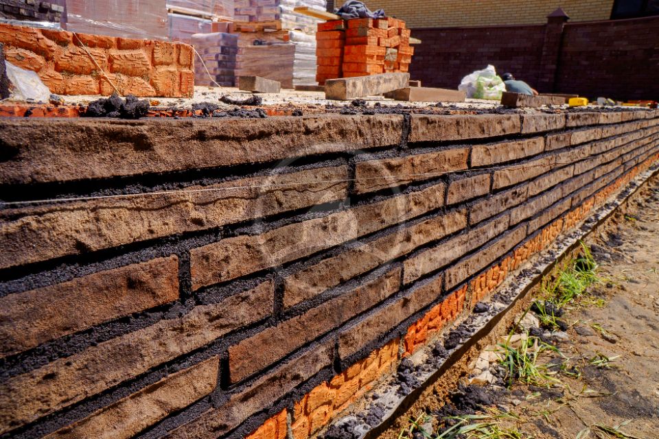 На цоколе Кирпич Облицовочный Полнотелый Ручной работы 475*85*40 М-125 F-300 Гаванера LS046 Донские Зори (кирпичдонские-зори.рф) на Цветной кладочной смеси PRIME LineBrick Wasser 4653 25кг./меш. Черная Perel.